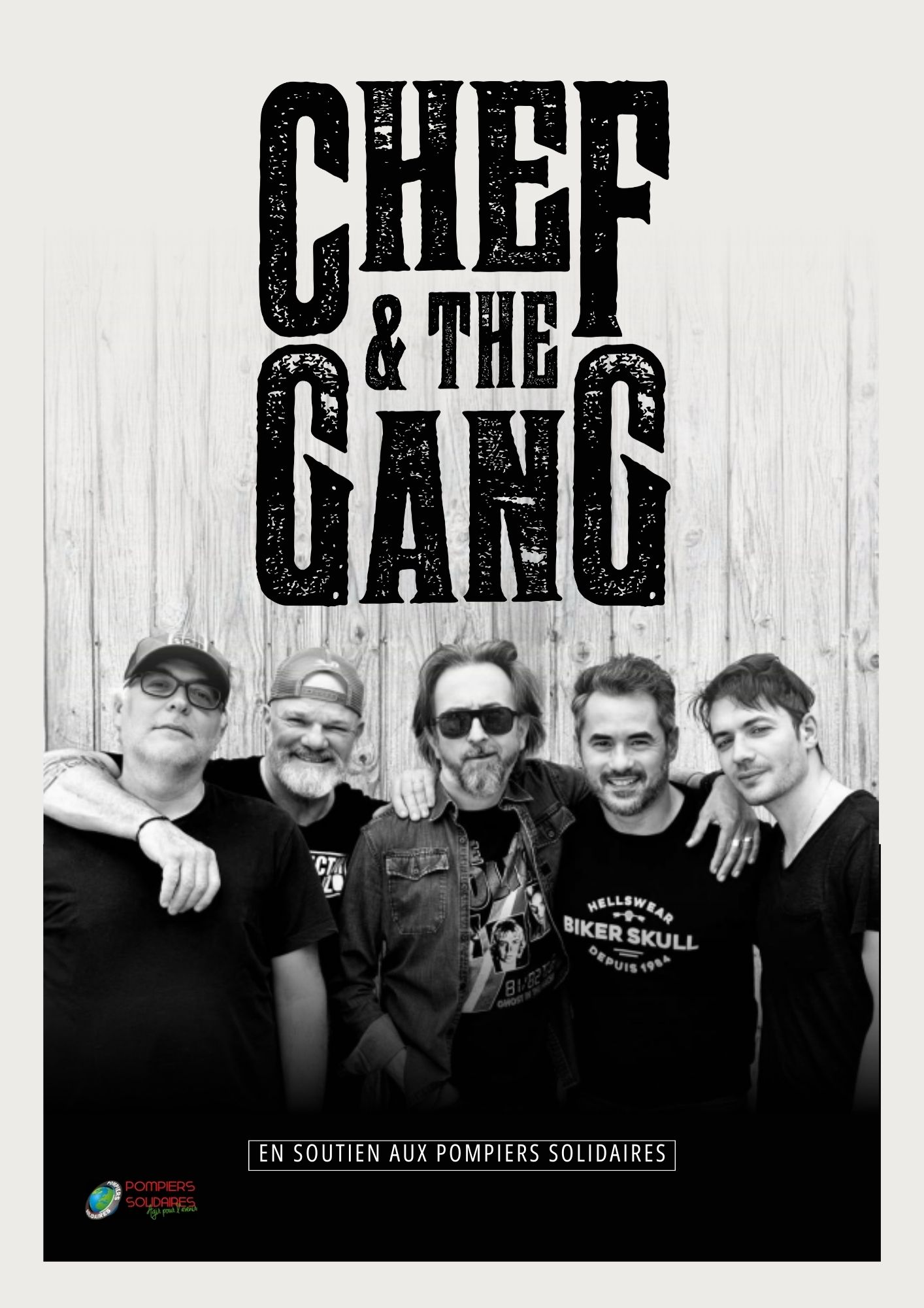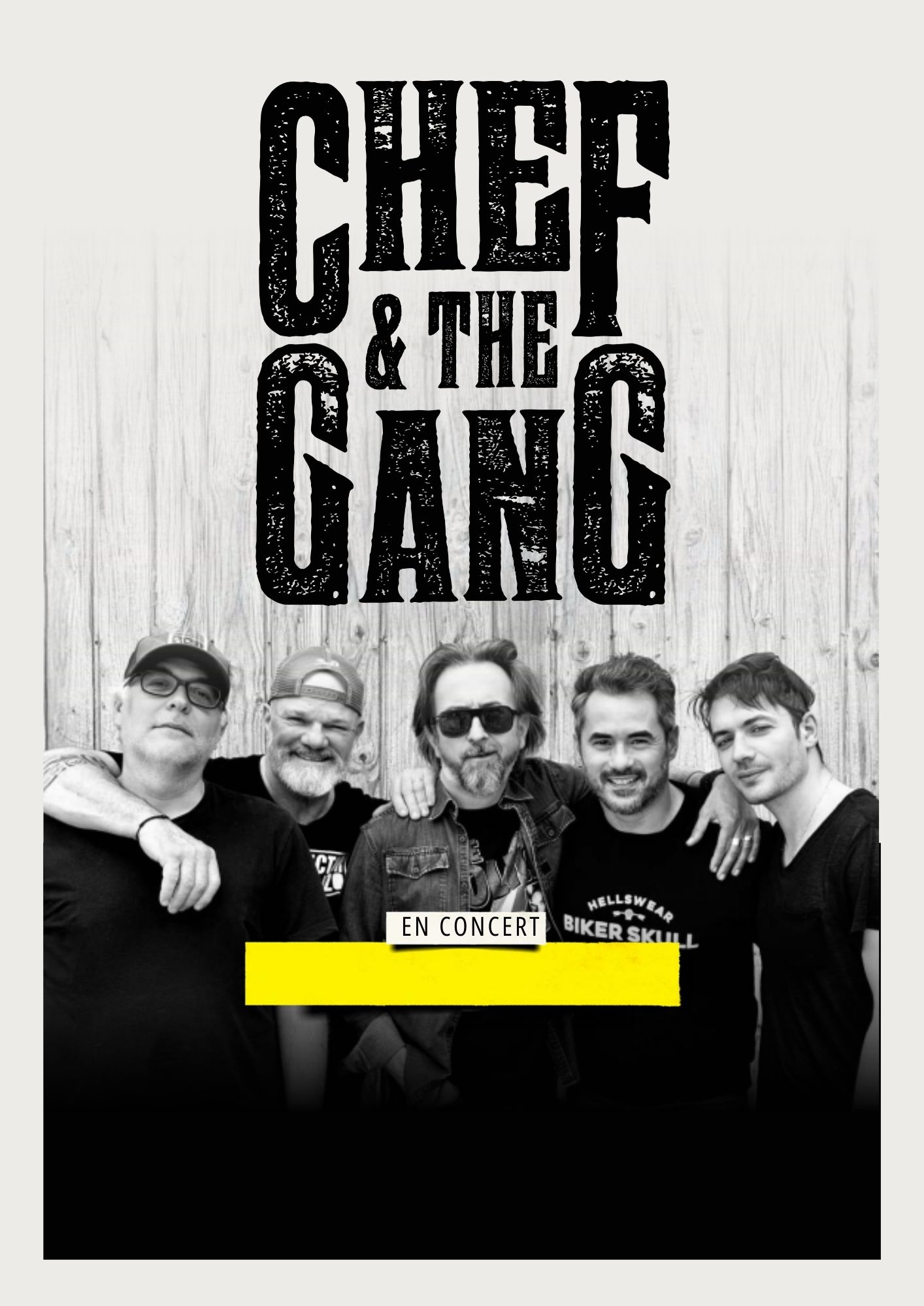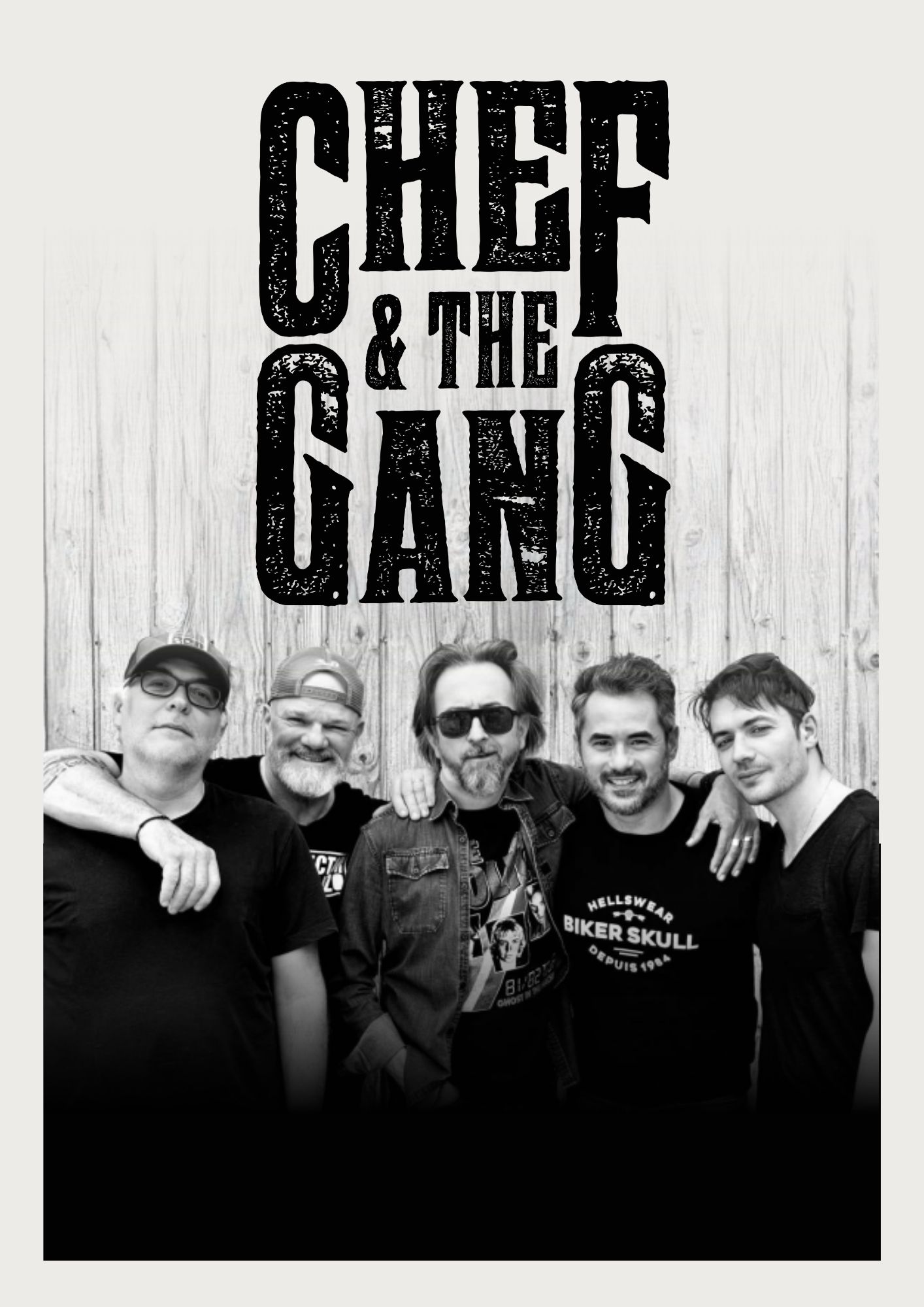 Chef & The Gang se produit en formation complète, avec batterie, guitares, basse, claviers et chant. Ce format est pensé pour une ambiance puissante et immersive, parfaitement adaptée aux concerts, festivals, événements municipaux et grandes scènes. La formation ne se décline pas en version acoustique, afin de préserver l’ADN rock et l’impact sonore du projet.