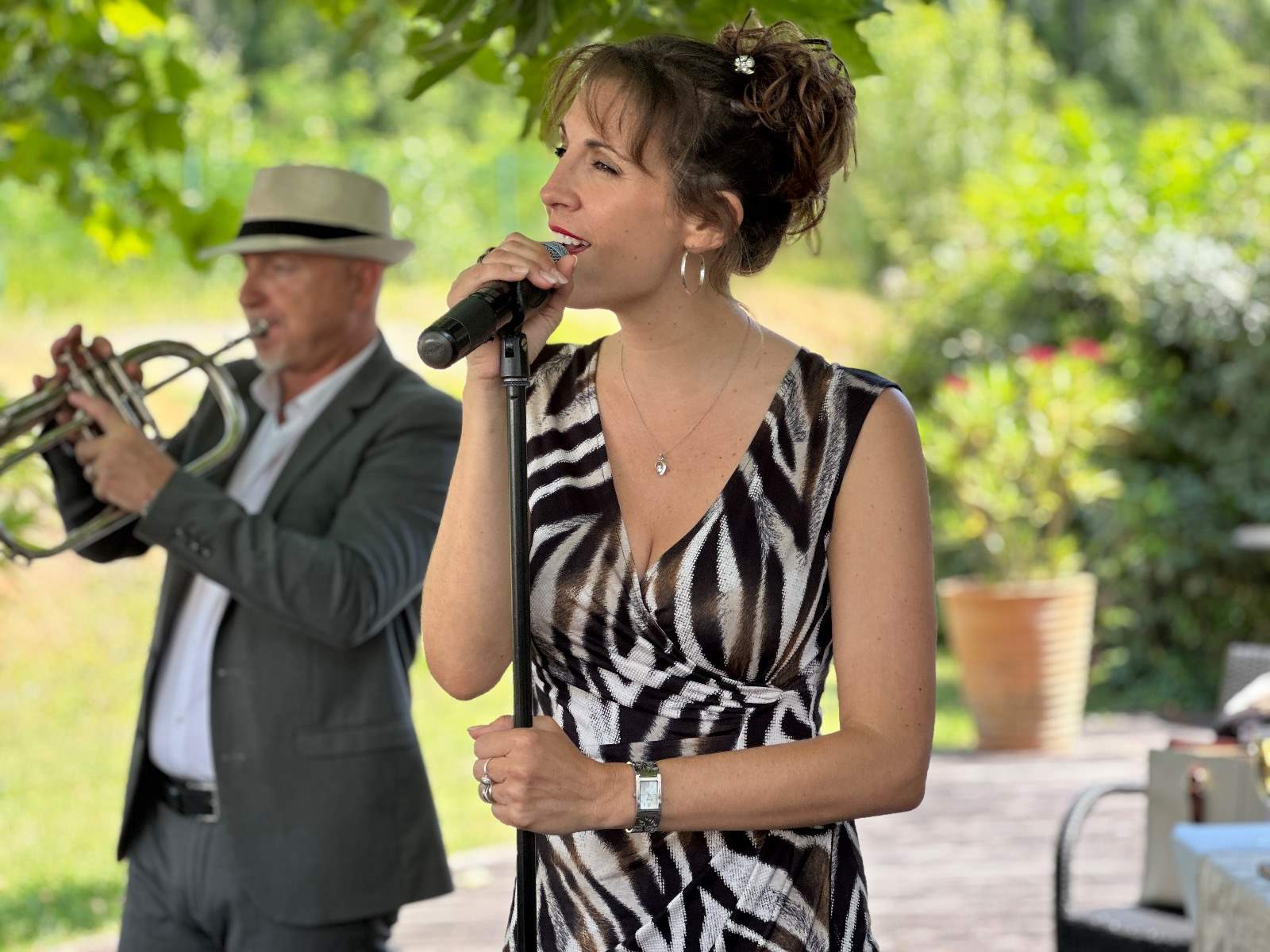 Duo chanteuse + chanteur/trompettiste : une formule équilibrée et dynamique, parfaite pour animer un repas ou une soirée entre les plats.