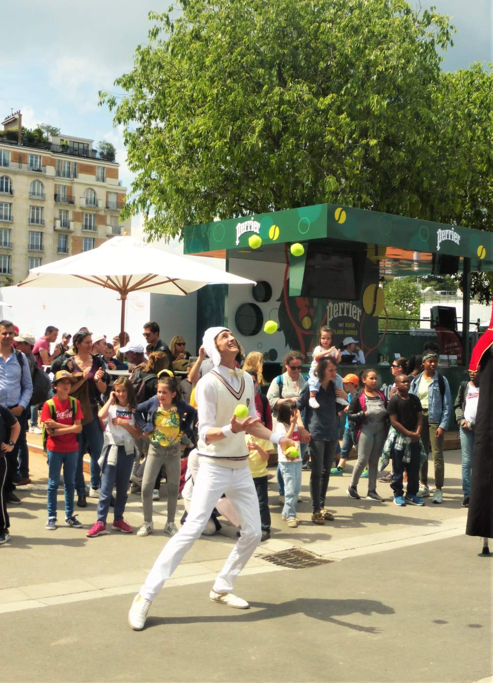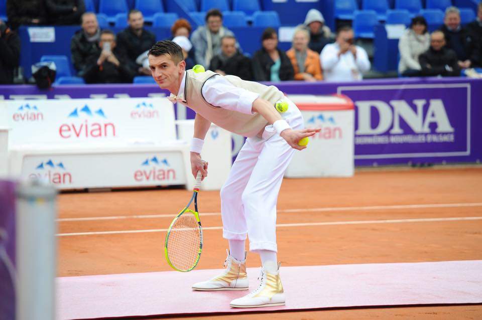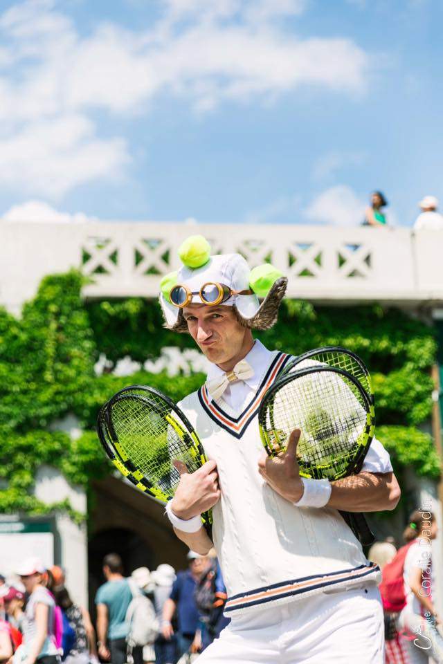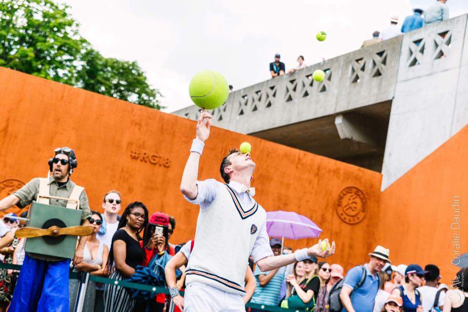 Dom-Dom, artiste franco-écossais professionnel trié sur le volet par Yohan Sati, vous propose un spectacle visuel singulier et festif : Les Raquettes de la Balle. Ce numéro burlesque de jonglerie humoristique autour de l’univers du tennis combine élégance rétro, performance physique et comédie visuelle. Incarnant un personnage atypique, mi-tennisman gentleman, mi-athlète désinvolte, Dom-Dom enchaîne les cascades, les jeux d’équilibre, les lancers de balles et les ratés hilarants avec une précision inspirée des maîtres du cinéma muet comme Jacques Tati ou Buster Keaton.